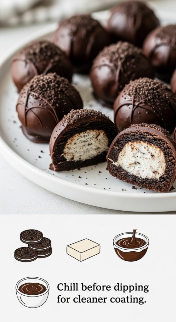 Crushed Oreos mixed with cream cheese and dipped in melted chocolate create bite-sized perfection.