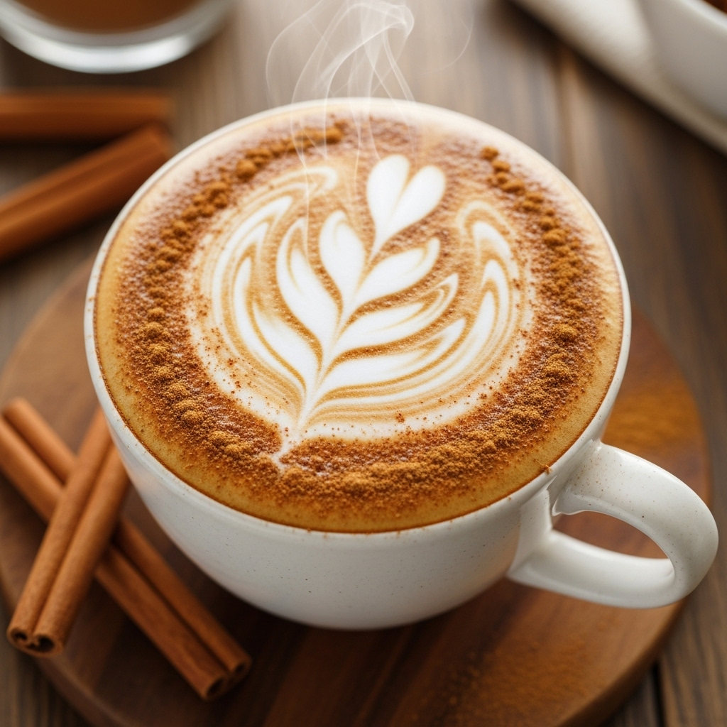 I brew coffee. I heat coconut milk. I pour the milk into the coffee. I sprinkle cinnamon on top.