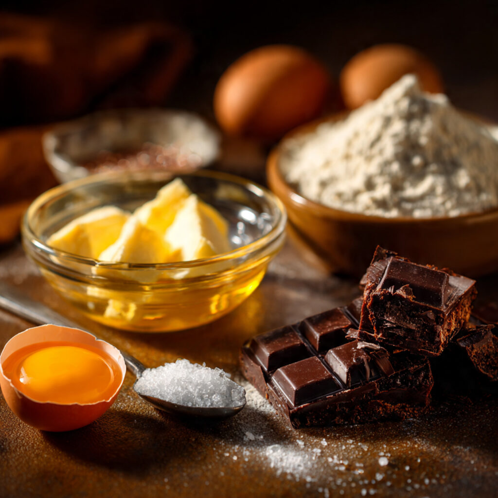 You need full-fat chocolate, butter, sugar, eggs, a small amount of flour, and a pinch of salt. Room-temperature ingredients and correct proportions are important.