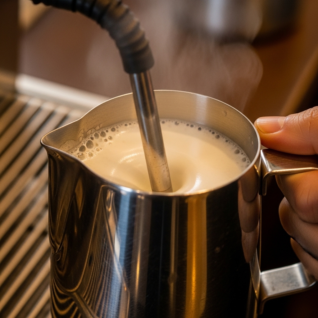 Baristas place the steam wand just below the milk surface. They introduce air slowly. They listen for a soft hissing sound.