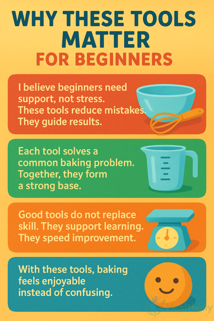 I believe beginners need basic tools first. Measuring cups, measuring spoons, mixing bowls, and a spatula matter most. These tools control accuracy and mixing. Without them, baking feels random.