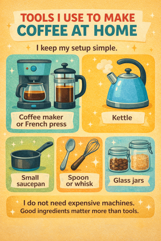 I only need basic tools. I use a coffee maker or French press. I use a kettle. I use a saucepan for milk. Simple tools work fine.