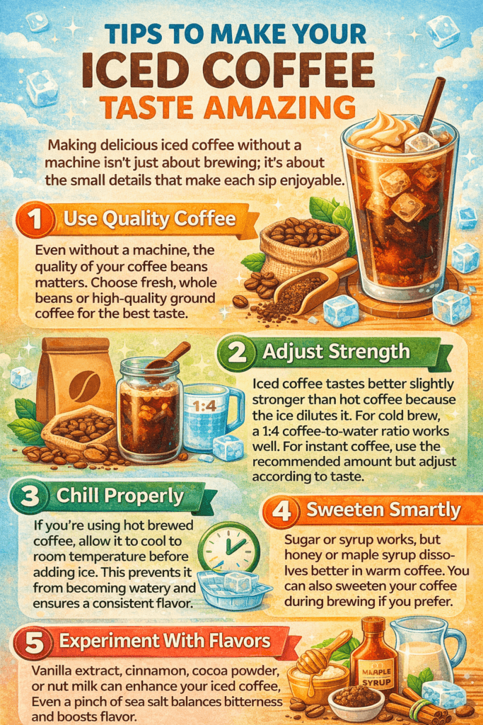 So grab your coffee, ice, and creativity. With a little effort, you can create iced coffee that’s rich, flavorful, and perfectly chilled — without spending a dime on a machine.