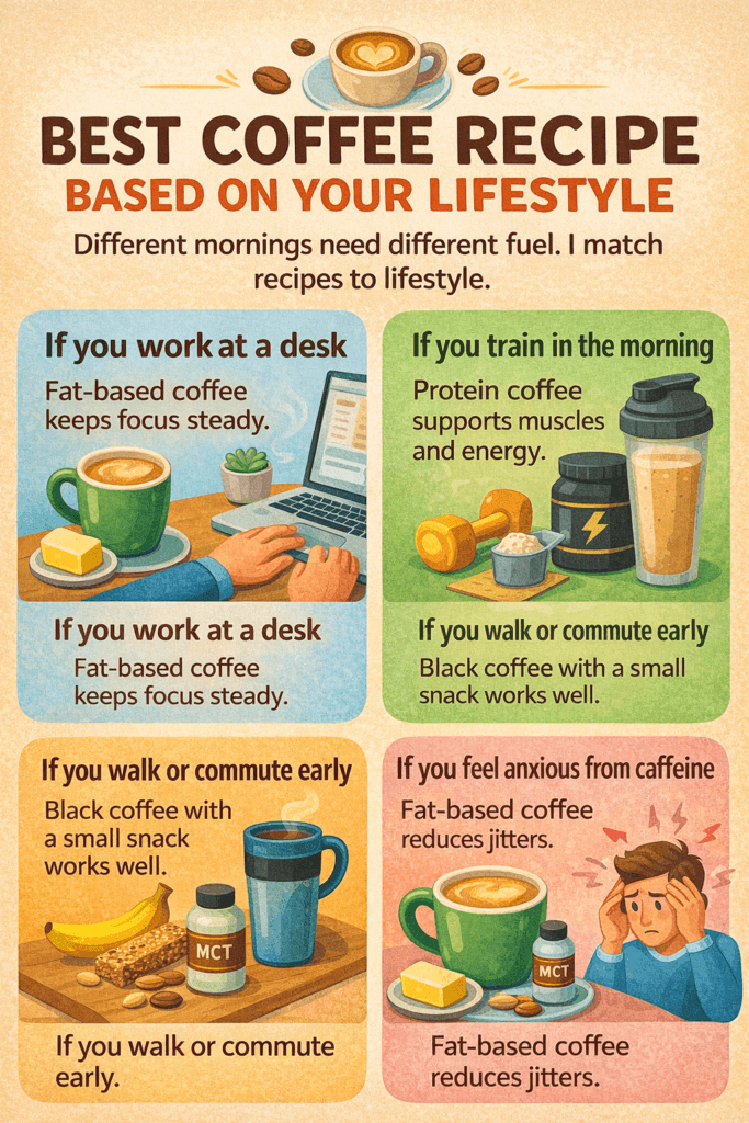 I find that a fat-based coffee made with black coffee and healthy fats gives the most steady morning energy. This recipe avoids sugar crashes and helps me stay focused for hours.