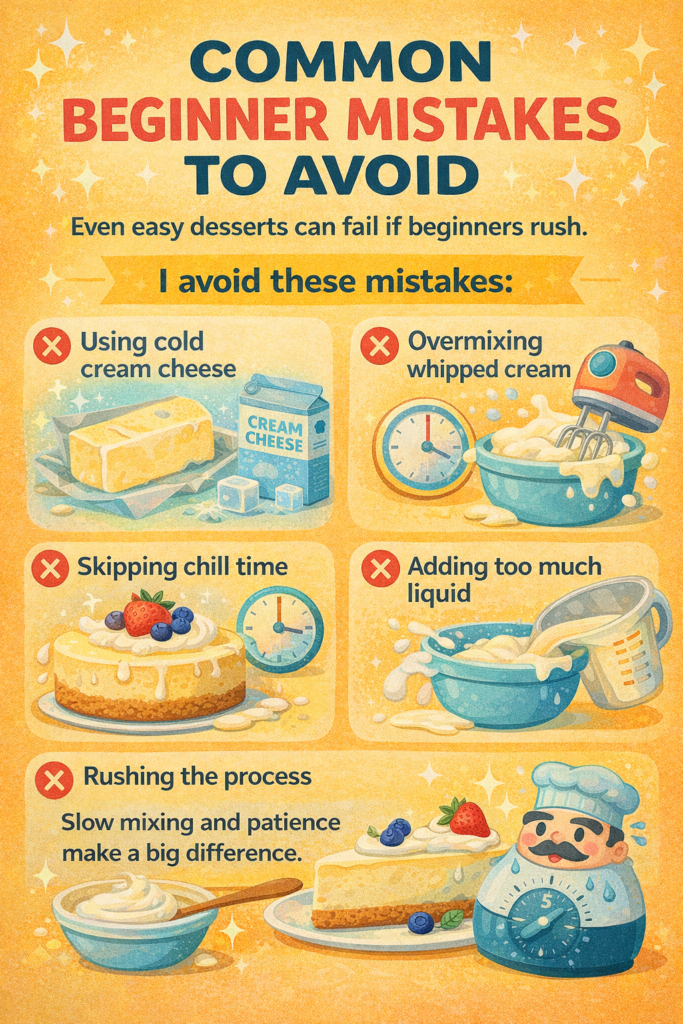 Beginners should avoid using cold cream cheese, overmixing whipped cream, and skipping chill time. Slow mixing and patience help create the best results.