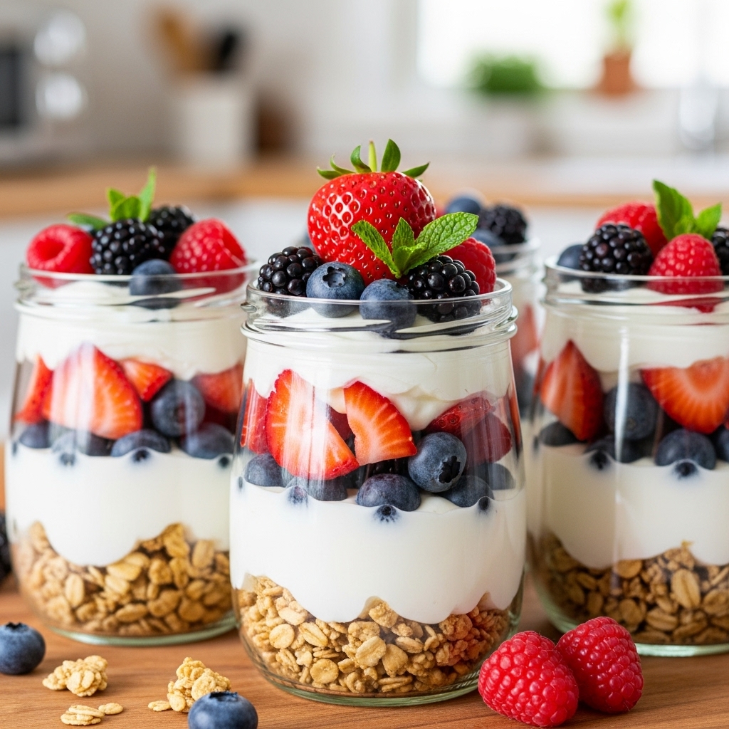 This option layers fruit, yogurt, and granola. It needs no cooking at all.