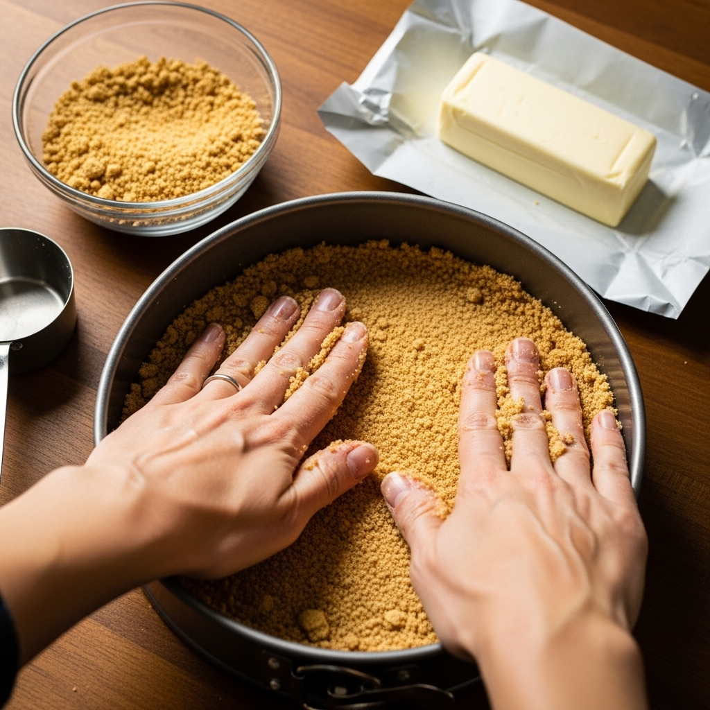 I crush graham crackers. I mix them with melted butter. I press the mixture into a pan.