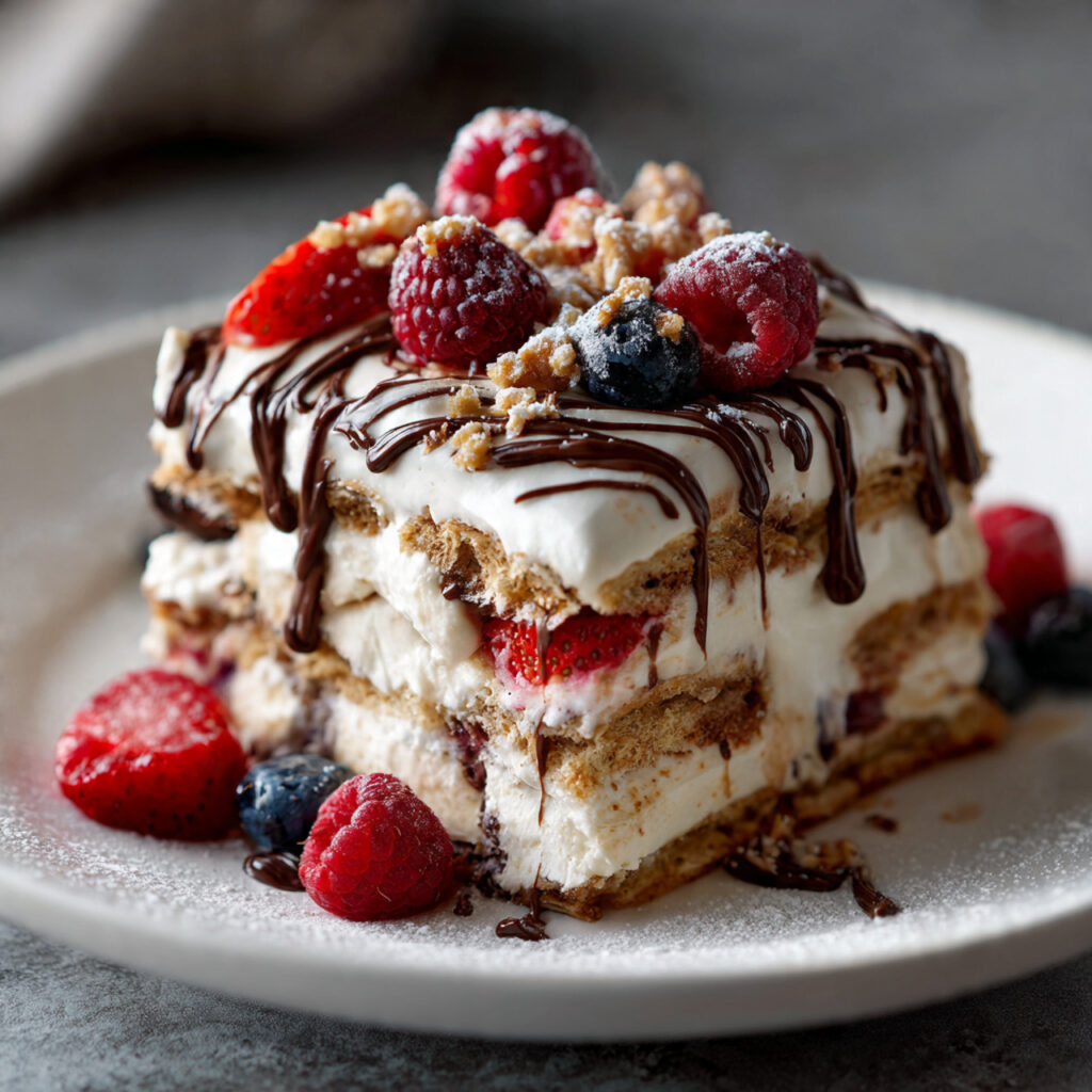 This dessert uses cookies and whipped cream. The fridge softens the layers overnight.