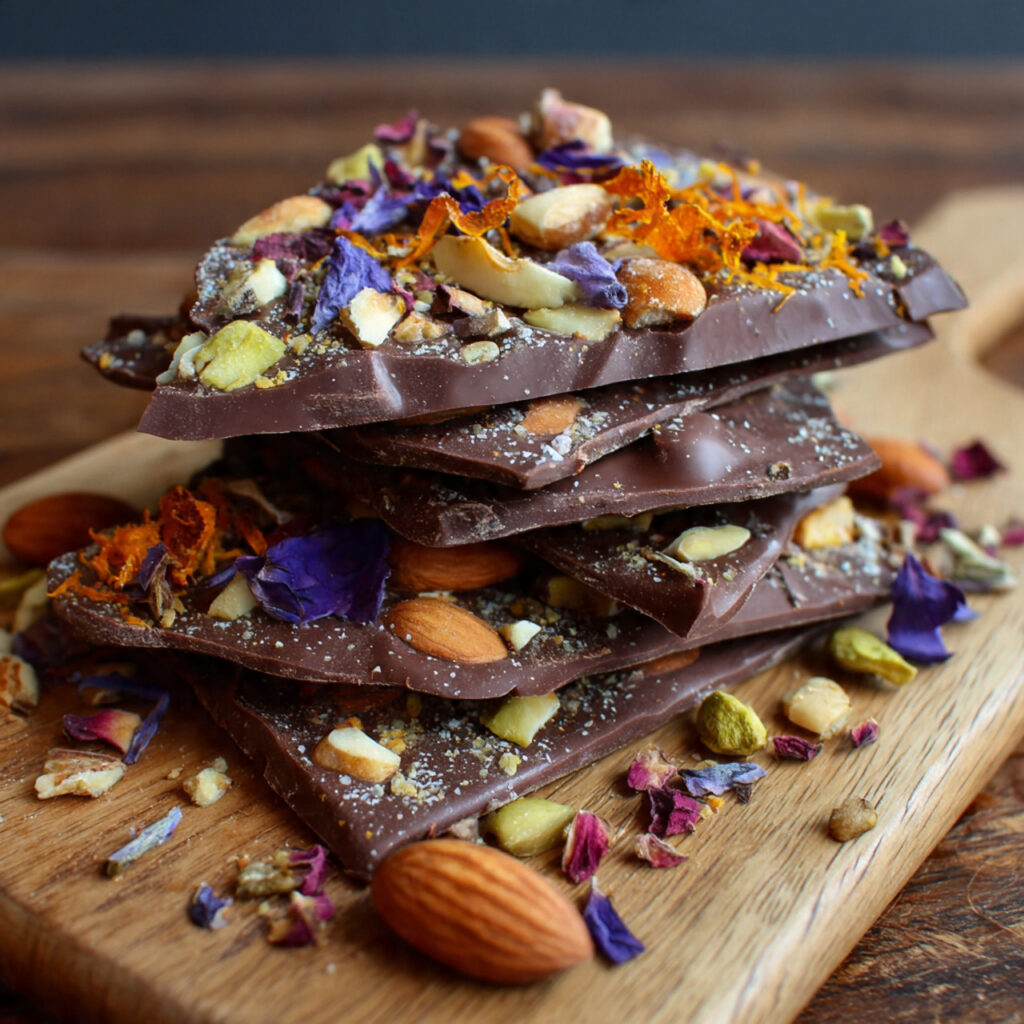 I spread melted chocolate on a tray. I sprinkle toppings and salt. I chill and break into pieces.